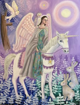ピンク色の光や天使の姿を素直にキャンバスに受けとめているうちに、「もっと自分を大切にしていい」と絵に教えられているように感じました。